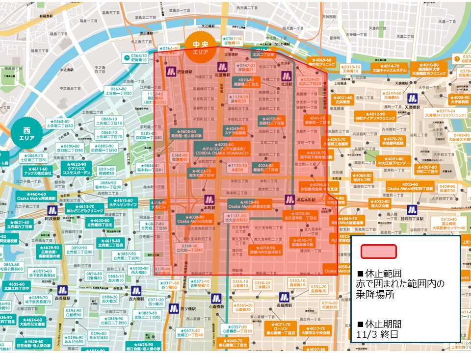 西・中央エリア、キタ・福島エリアの一部乗降場所を休止します。