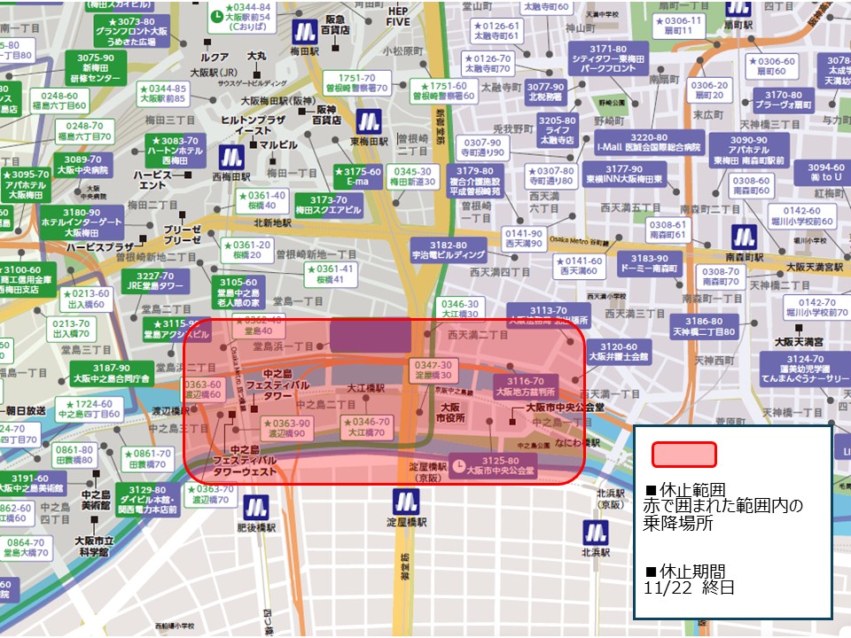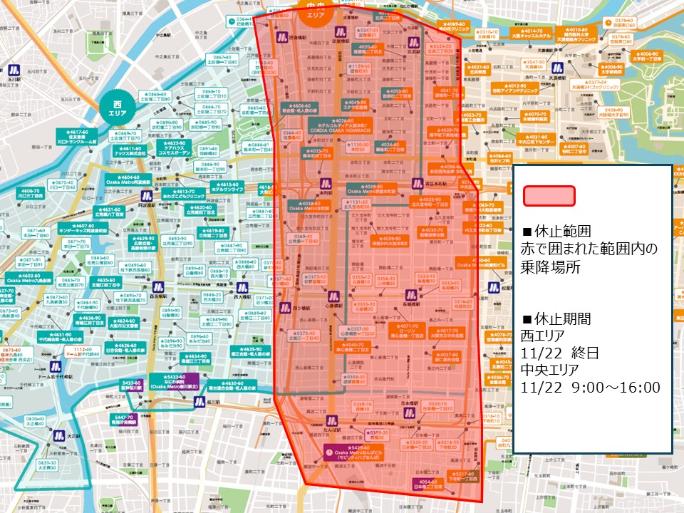 2025年11月22日(土)阪神タイガース優勝パレードに伴い、オンデマンドバスの西・中央エリア、キタ・福島エリアの一部乗降場所を休止します。