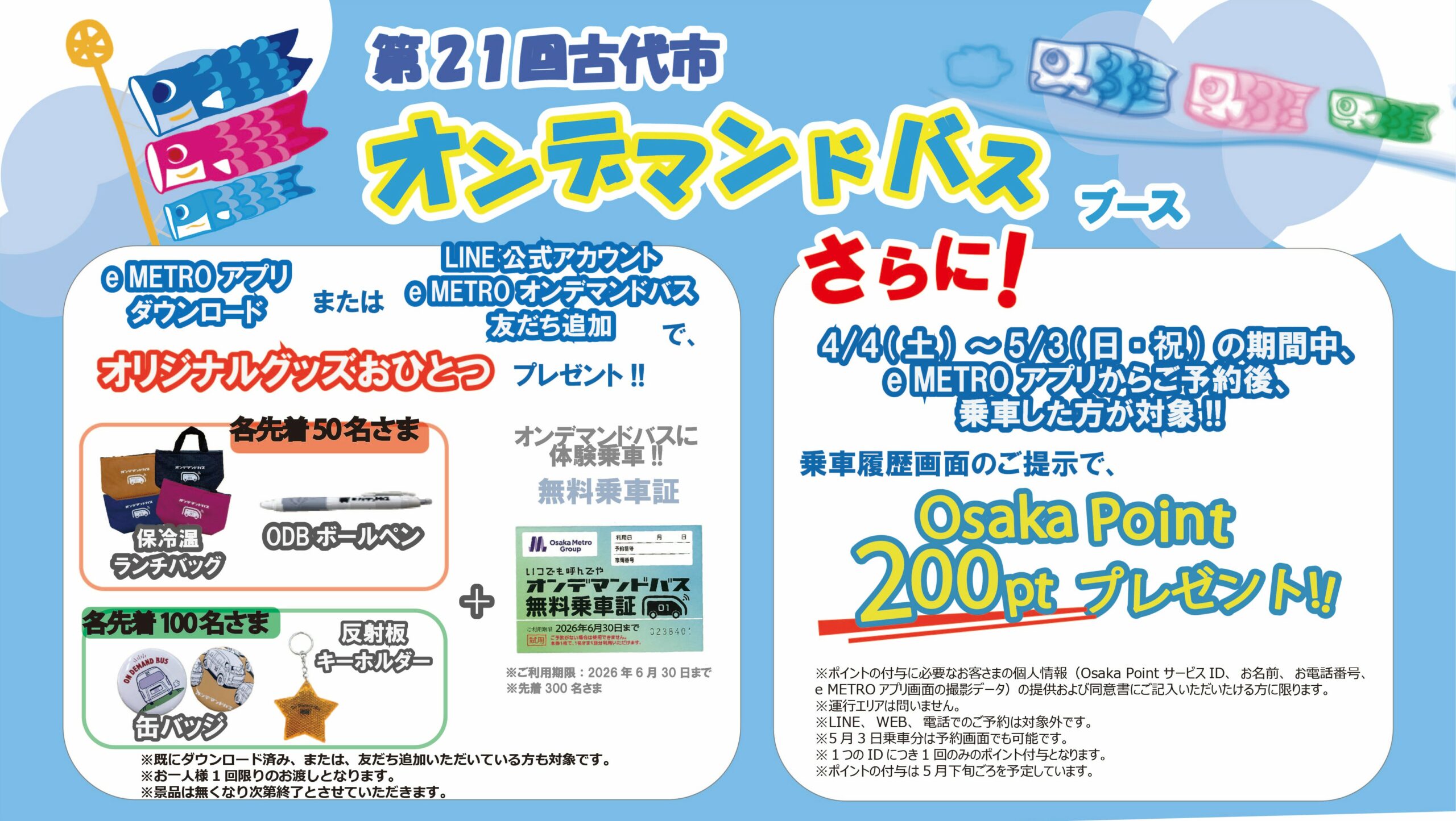 2026年5月3日(日・祝)開催の古代市オンデマンドバスブースで、e METROアプリのキャンペーン期間中の乗車履歴画面(5月3日乗車分については予約画面でも可)を提示のうえ、ポイントの付与に必要なお客様の情報(Osaka Point サービスID、お名前、お電話番号、撮影データ)を提供いただくこと。